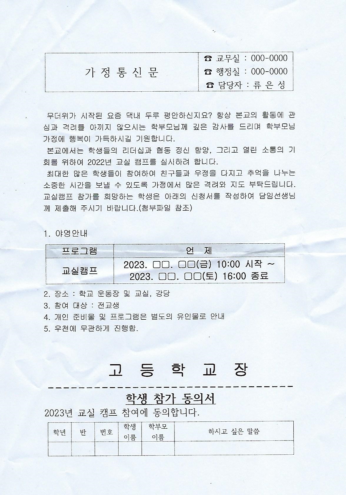 그리고 열린 소통의 기회를 위하여 방과후 교실 캠프를 실시하려 합니다.