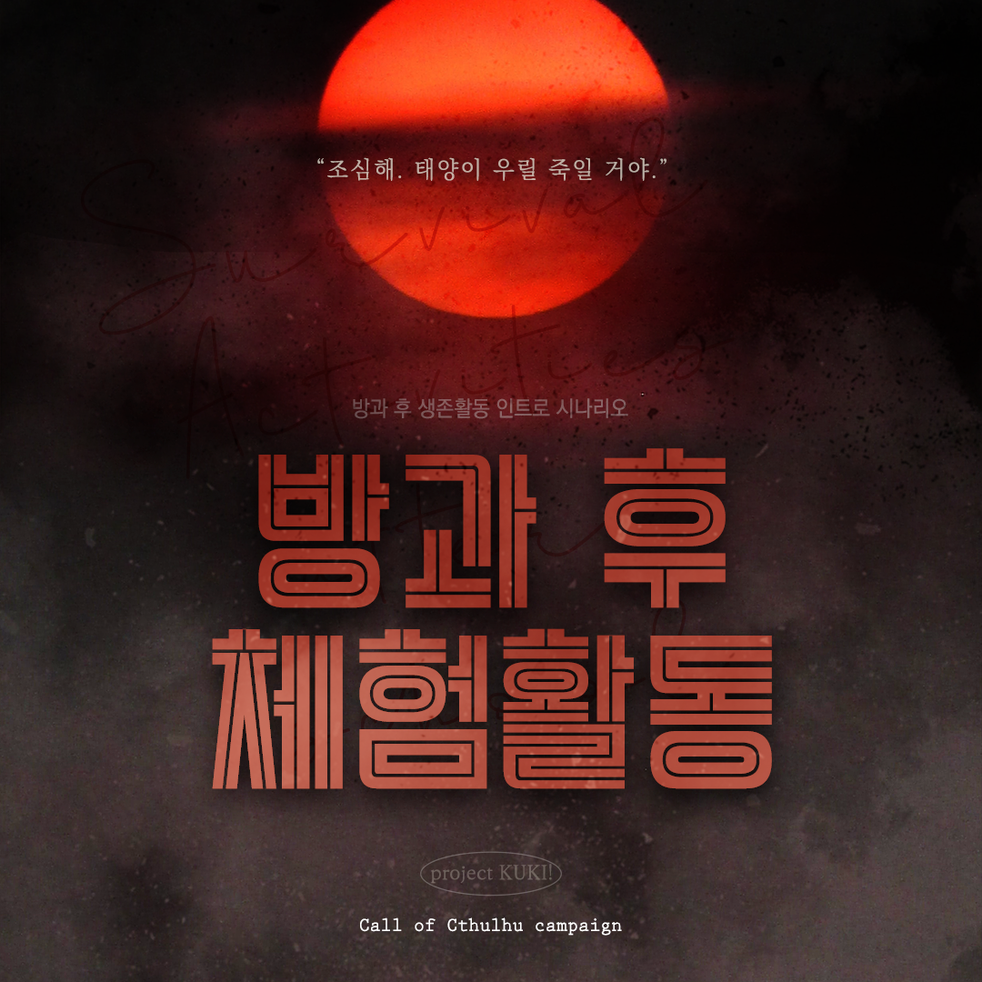 - 본 시나리오는 프로젝트 쿠키에서 제작한 크툴루의 부름(Call of Cthulhu) 시나리오 “방과 후 생존활동”의 인트로 시나리오입니다. 다른 ‘방과 후 생존활동’의 시나리오와 마찬가지로 최종 수정본이 인쇄본에 포함되어 있습니다.