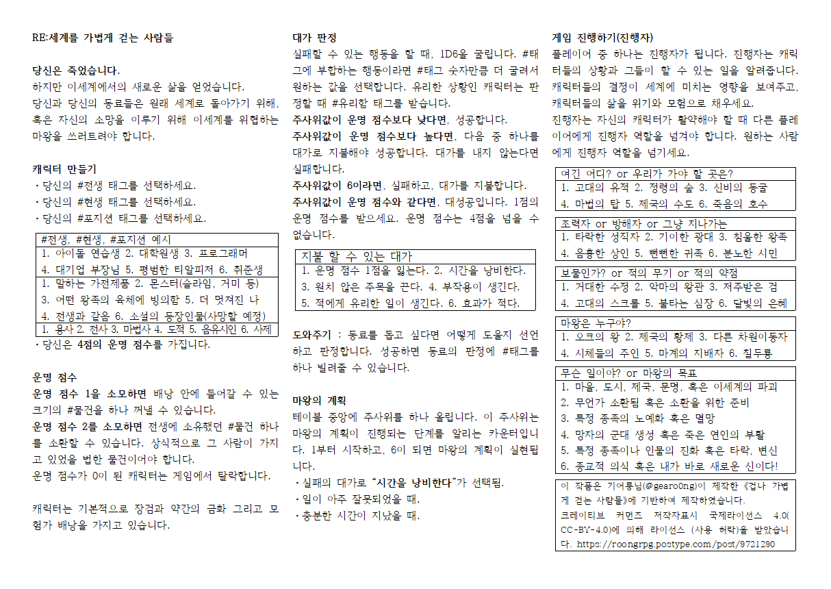 [Re:세계를 가볍게 걷는 사람들]은 흔히 《이세계물(Isekai)》이라고 불리는 장르를 구현하기 위한 원페이지 TRPG입니다