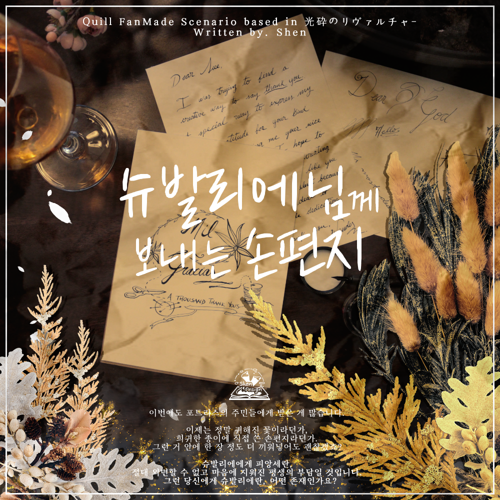 | 본작은 스콧 멀트하우스 제작 룰, [{혼자 노는 RPG Quill(퀼)} Quill: A Letter-Writing Roleplaying Game for a Single Player] 을 사용해 작성된 비공식 시나리오로 원작자와 번역자의 저작권 및 제반 권리를 침해할 의도가 없습니다. |