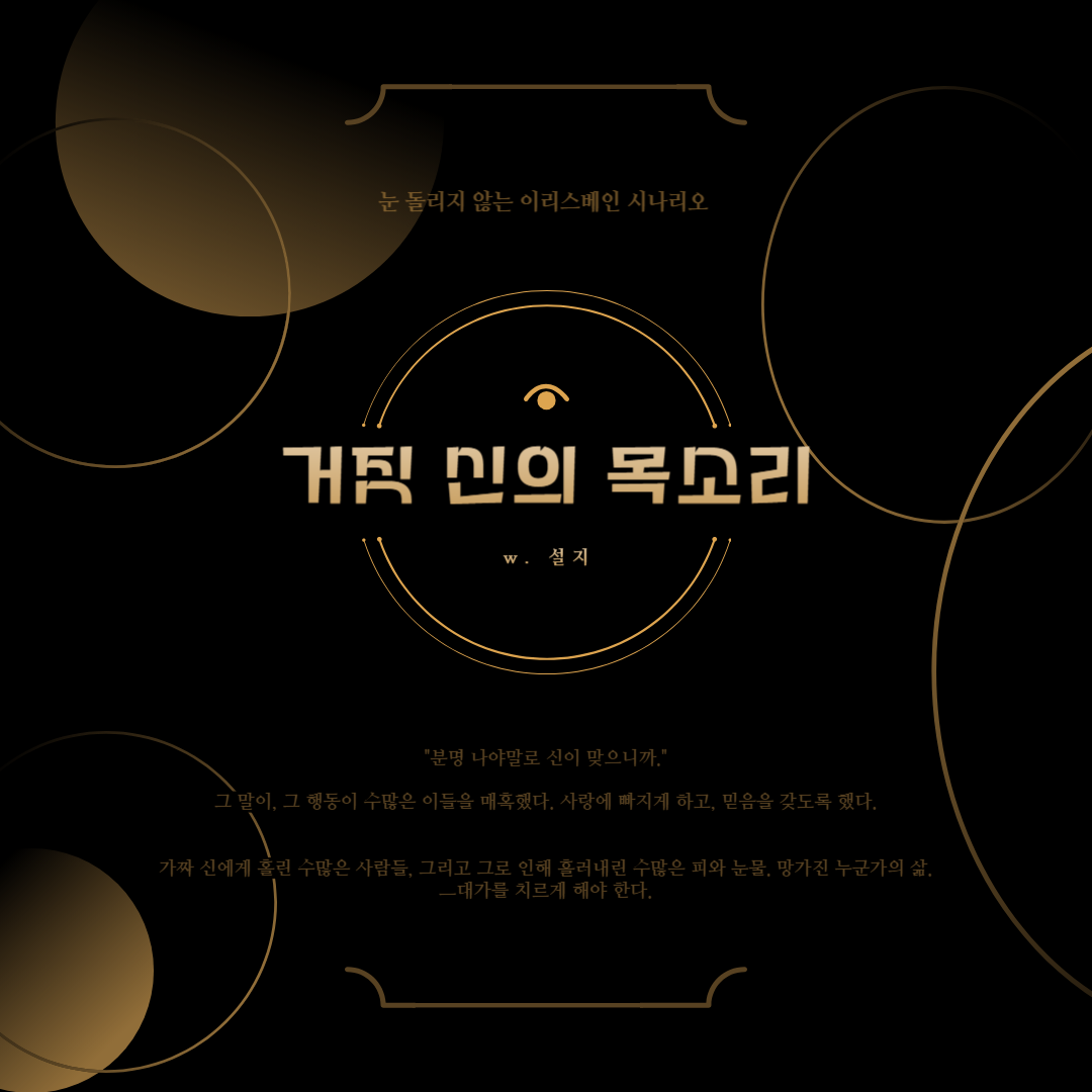 가짜 신에게 홀린 수많은 사람들, 그리고 그로 인해 흘러내린 수많은 피와 눈물. 망가진 누군가의 삶.
