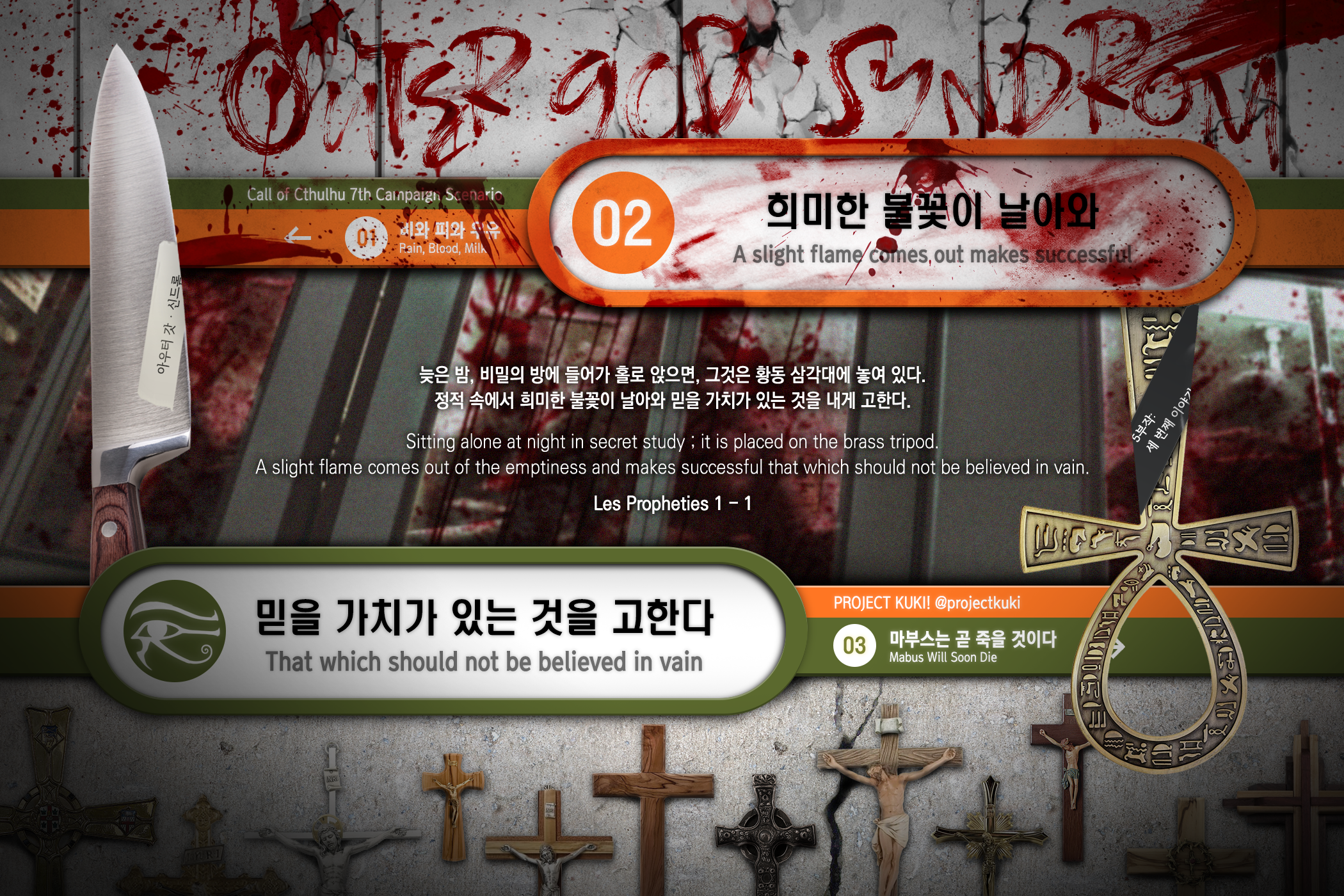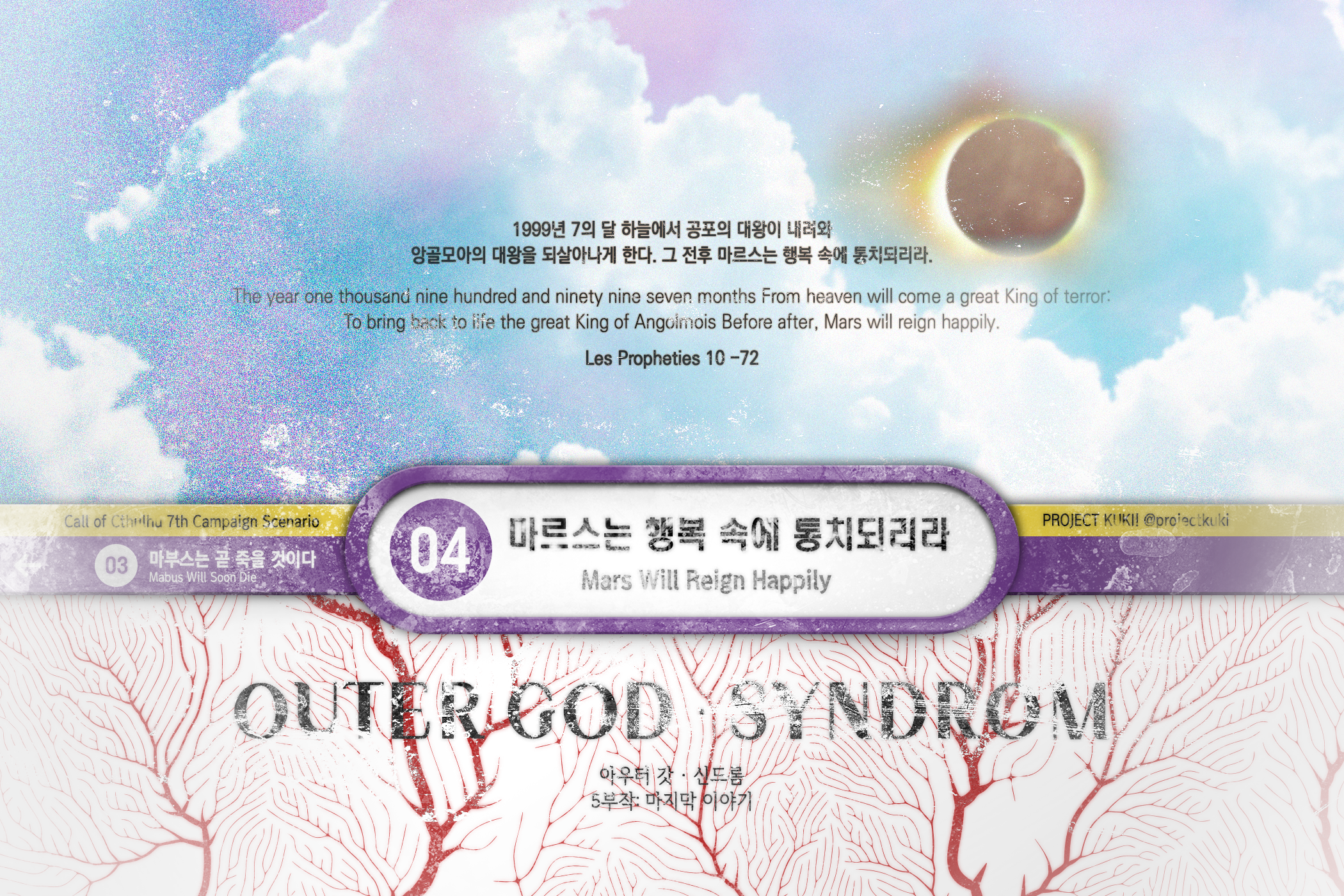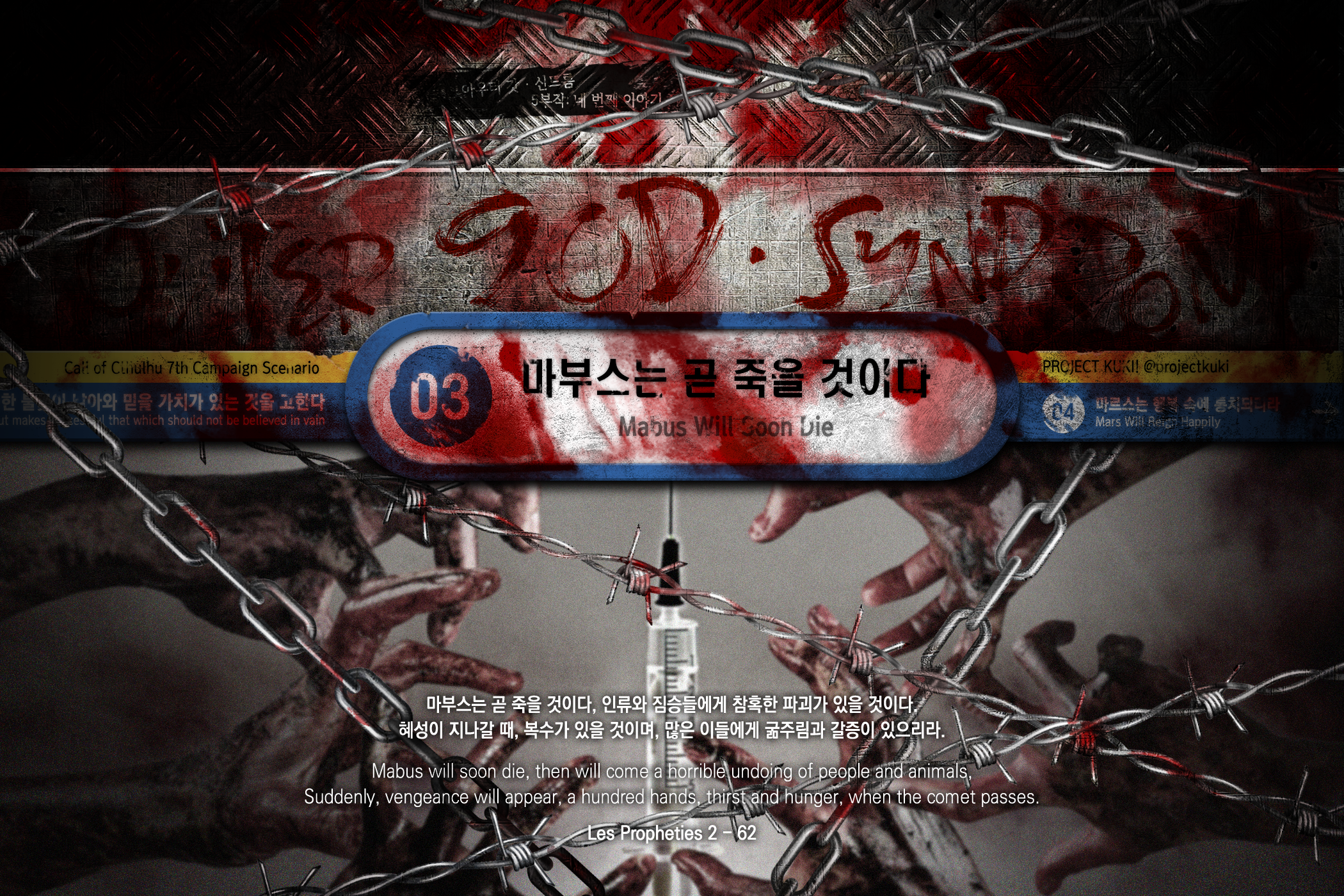 - 본 시나리오에는 크툴루의 부름 TRPG가 제시하는 기본적인 유해요소와 더불어 살인, 고어, 좀비, 신체 절단, 신체 변형, 자해, 자살, 사이비 종교 등 지극히 폭력적이고 자극적인 이야기를 다루고 있습니다. 사용과 열람에 충분한 주의가 필요합니다.